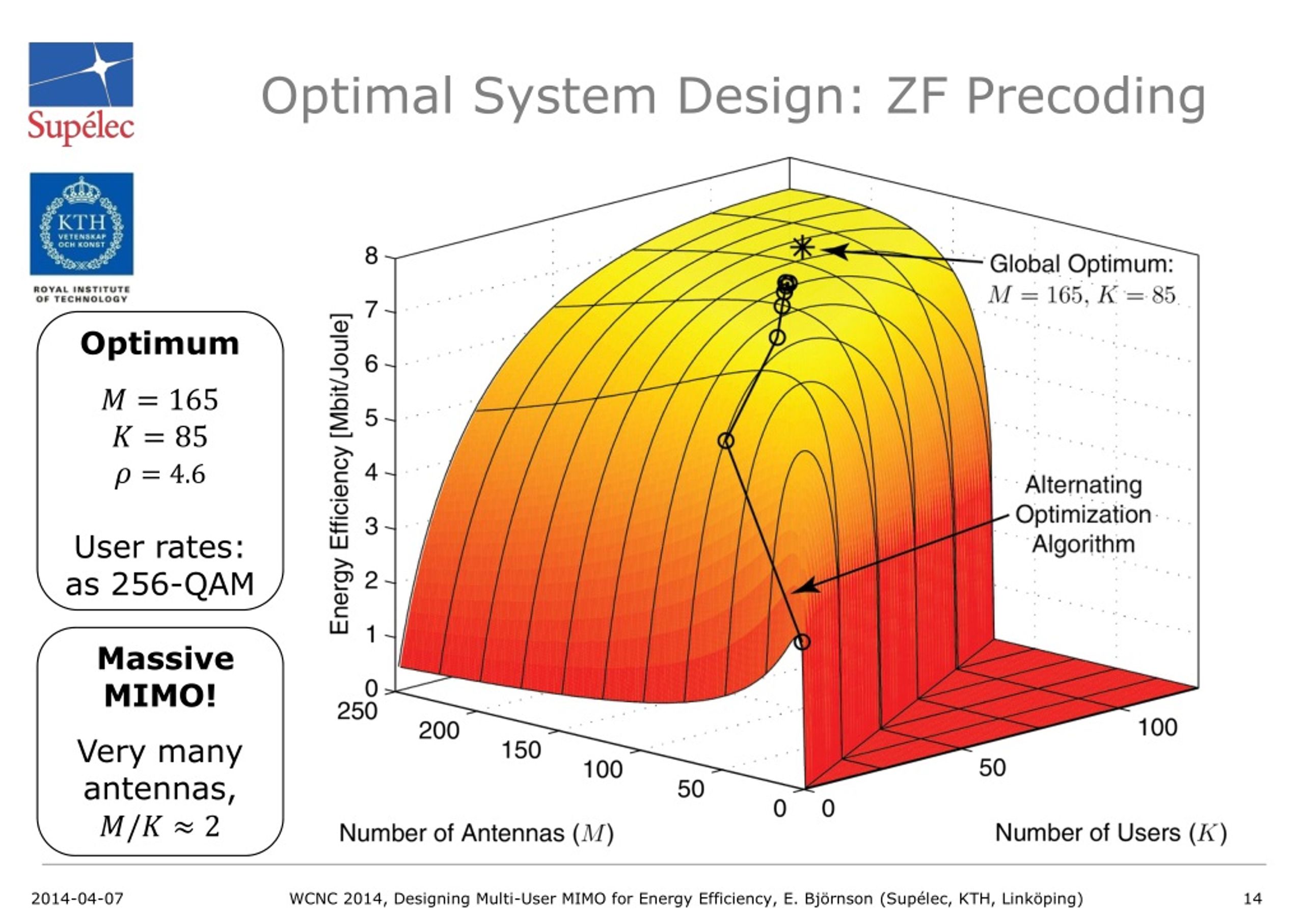 Optimal System Design: ZF Precoding Optimum User rates: as 256-QAM Massive MIMO! Very many antennas, WCNC 2014, Designing Multi-User MIMO for Energy Efficiency, E. Björnson (Supélec, KTH, Linköping)