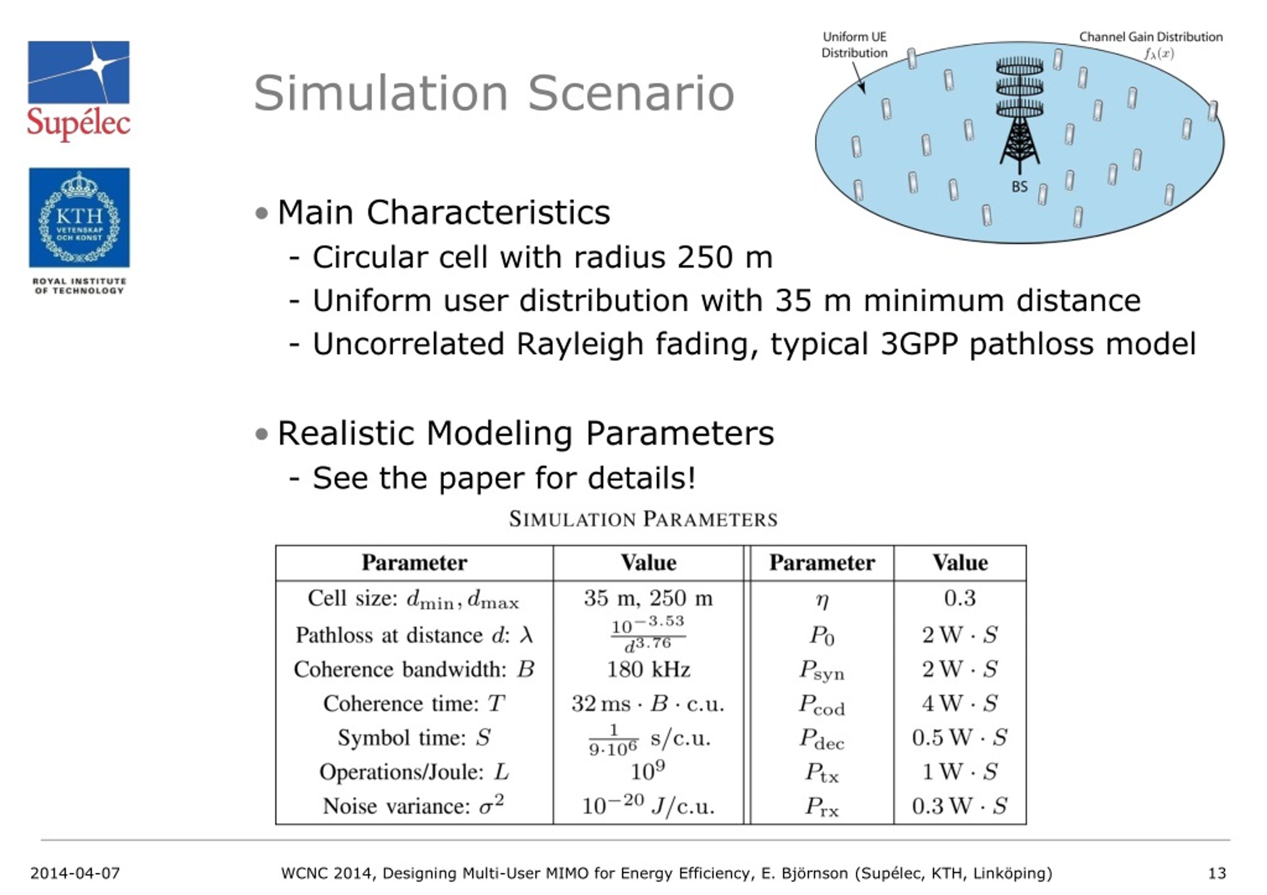 Simulation Scenario • Main Characteristics • Circular cell with radius 250 m • Uniform user distribution with 35 m minimum distance • Uncorrelated Rayleigh fading, typical 3GPP pathloss model • Realistic Modeling Parameters • See the paper for details! WCNC 2014, Designing Multi-User MIMO for Energy Efficiency, E. Björnson (Supélec, KTH, Linköping)