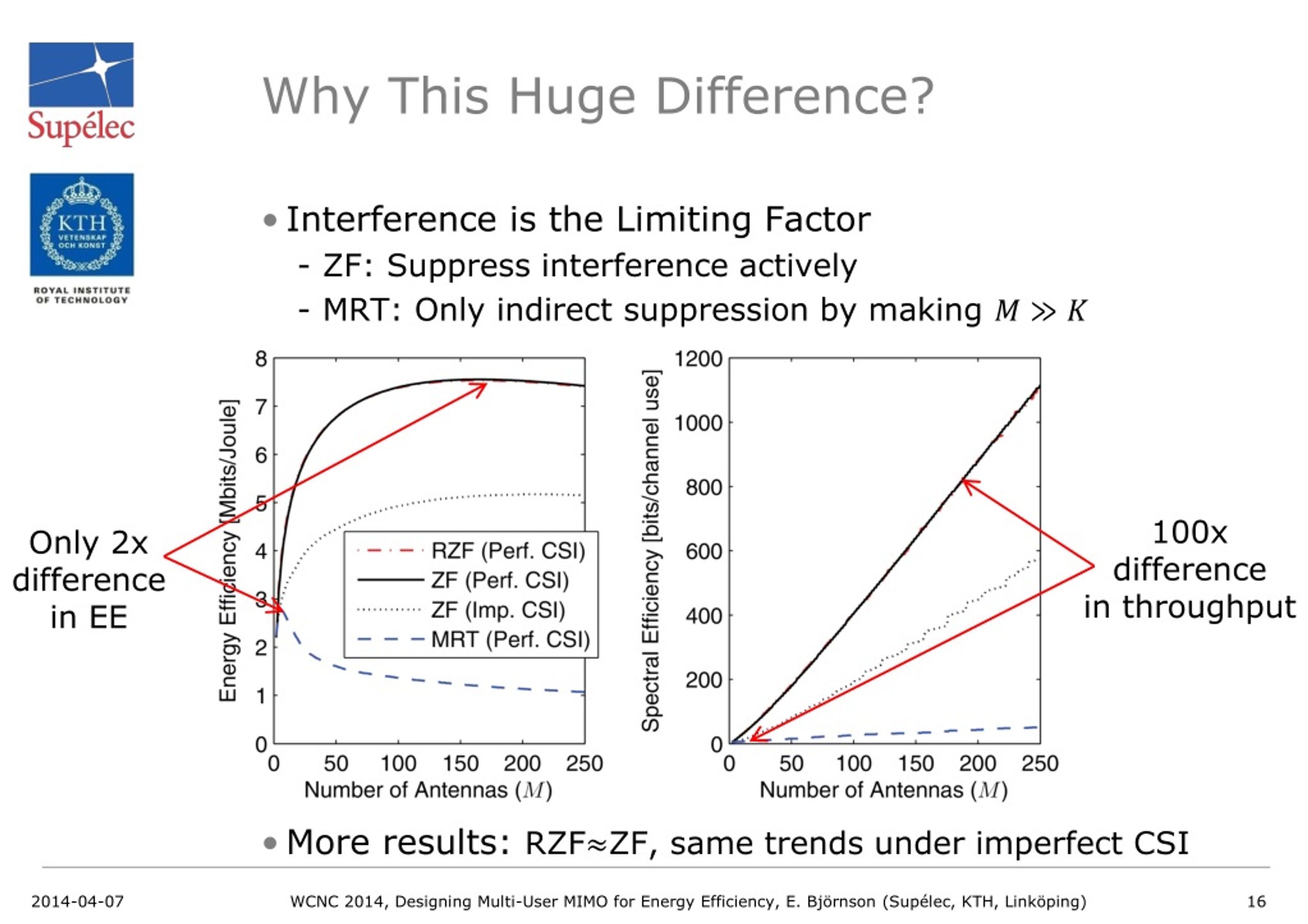 Why This Huge Difference? • Interference is the Limiting Factor • ZF: Suppress interference actively • MRT: Only indirect suppression by making • More results: RZFZF, same trends under imperfect CSI • 100x • difference • in throughput • Only 2x • difference • in EE WCNC 2014, Designing Multi-User MIMO for Energy Efficiency, E. Björnson (Supélec, KTH, Linköping)