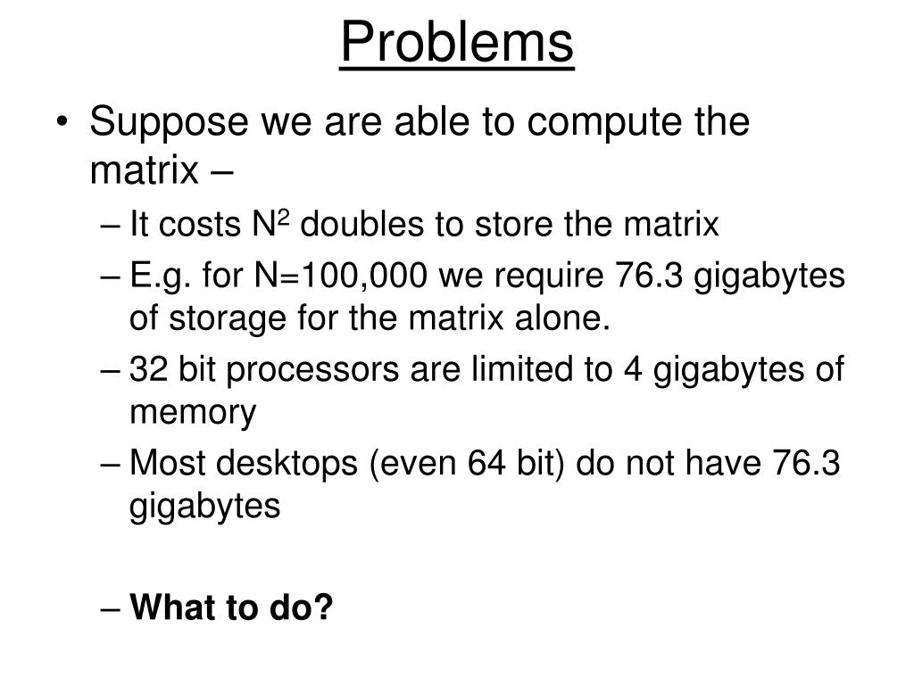 Problems • Suppose we are able to compute the matrix – • It costs N2 doubles to store the matrix • E.g. for N=100,000 we require 76.3 gigabytes of storage for the matrix alone. • 32 bit processors are limited to 4 gigabytes of memory • Most desktops (even 64 bit) do not have 76.3 gigabytes • What to do?