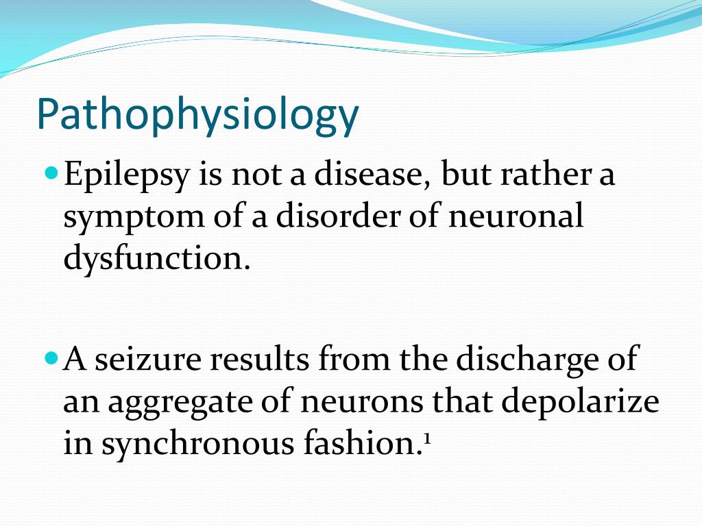 Pathophysiology • Epilepsy is not a disease, but rather a symptom of a disorder of neuronal dysfunction. • A seizure results from the discharge of an aggregate of neurons that depolarize in synchronous fashion.1