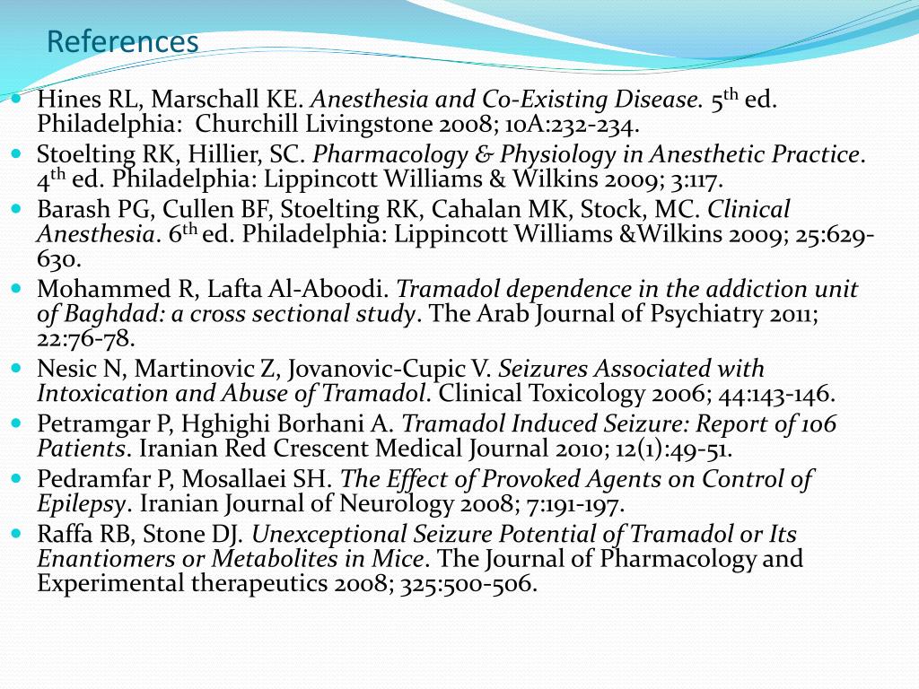 References • Hines RL, Marschall KE. Anesthesia and Co-Existing Disease. 5th ed. Philadelphia: Churchill Livingstone 2008; 10A:232-234. • Stoelting RK, Hillier, SC. Pharmacology & Physiology in Anesthetic Practice. 4th ed. Philadelphia: Lippincott Williams & Wilkins 2009; 3:117. • Barash PG, Cullen BF, Stoelting RK, Cahalan MK, Stock, MC. Clinical Anesthesia. 6th ed. Philadelphia: Lippincott Williams &Wilkins 2009; 25:629-630. • Mohammed R, Lafta Al-Aboodi. Tramadol dependence in the addiction unit of Baghdad: a cross sectional study. The Arab Journal of Psychiatry 2011; 22:76-78. • Nesic N, Martinovic Z, Jovanovic-Cupic V. Seizures Associated with Intoxication and Abuse of Tramadol. Clinical Toxicology 2006; 44:143-146. • Petramgar P, HghighiBorhani A. Tramadol Induced Seizure: Report of 106 Patients. Iranian Red Crescent Medical Journal 2010; 12(1):49-51. • Pedramfar P, Mosallaei SH. The Effect of Provoked Agents on Control of Epilepsy. Iranian Journal of Neurology 2008; 7:191-197. • Raffa RB, Stone DJ. Unexceptional Seizure Potential of Tramadol or Its Enantiomers or Metabolites in Mice. The Journal of Pharmacology and Experimental therapeutics 2008; 325:500-506.
