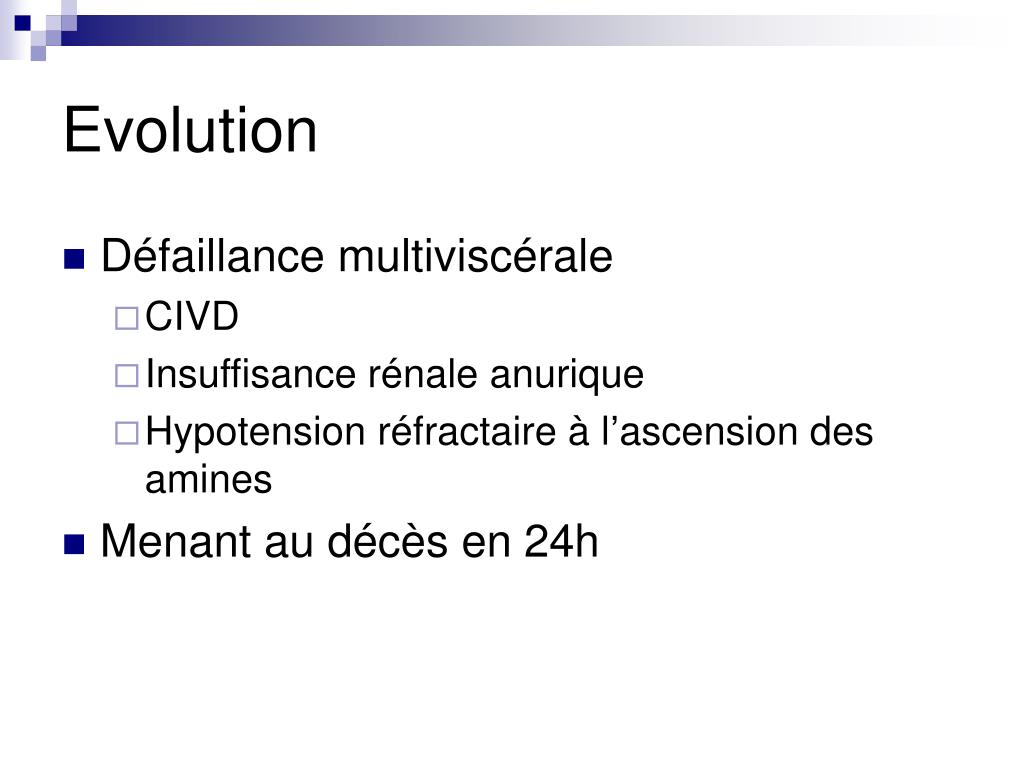 Evolution • Défaillance multiviscérale • CIVD • Insuffisance rénale anurique • Hypotension réfractaire à l’ascension des amines • Menant au décès en 24h