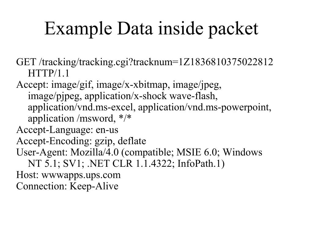 Example Data inside packet GET /tracking/tracking.cgi?tracknum=1Z1836810375022812 HTTP/1.1 Accept: image/gif, image/x-xbitmap, image/jpeg, image/pjpeg, application/x-shock wave-flash, application/vnd.ms-excel, application/vnd.ms-powerpoint, application /msword, */* Accept-Language: en-us Accept-Encoding: gzip, deflate User-Agent: Mozilla/4.0 (compatible; MSIE 6.0; Windows NT 5.1; SV1; .NET CLR 1.1.4322; InfoPath.1) Host: wwwapps.ups.com Connection: Keep-Alive