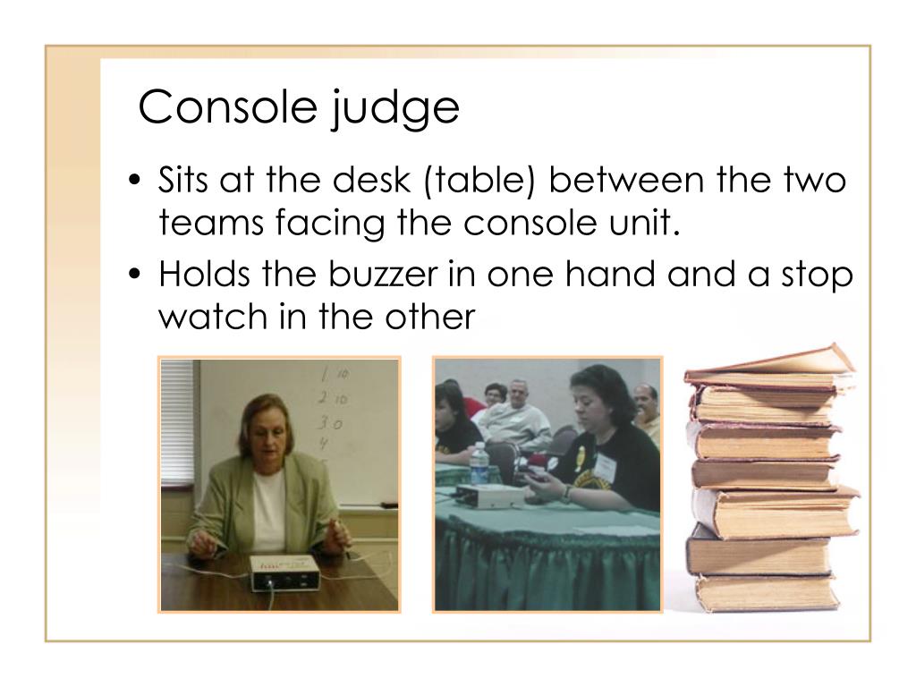 Console judge • Sits at the desk (table) between the two teams facing the console unit. • Holds the buzzer in one hand and a stop watch in the other