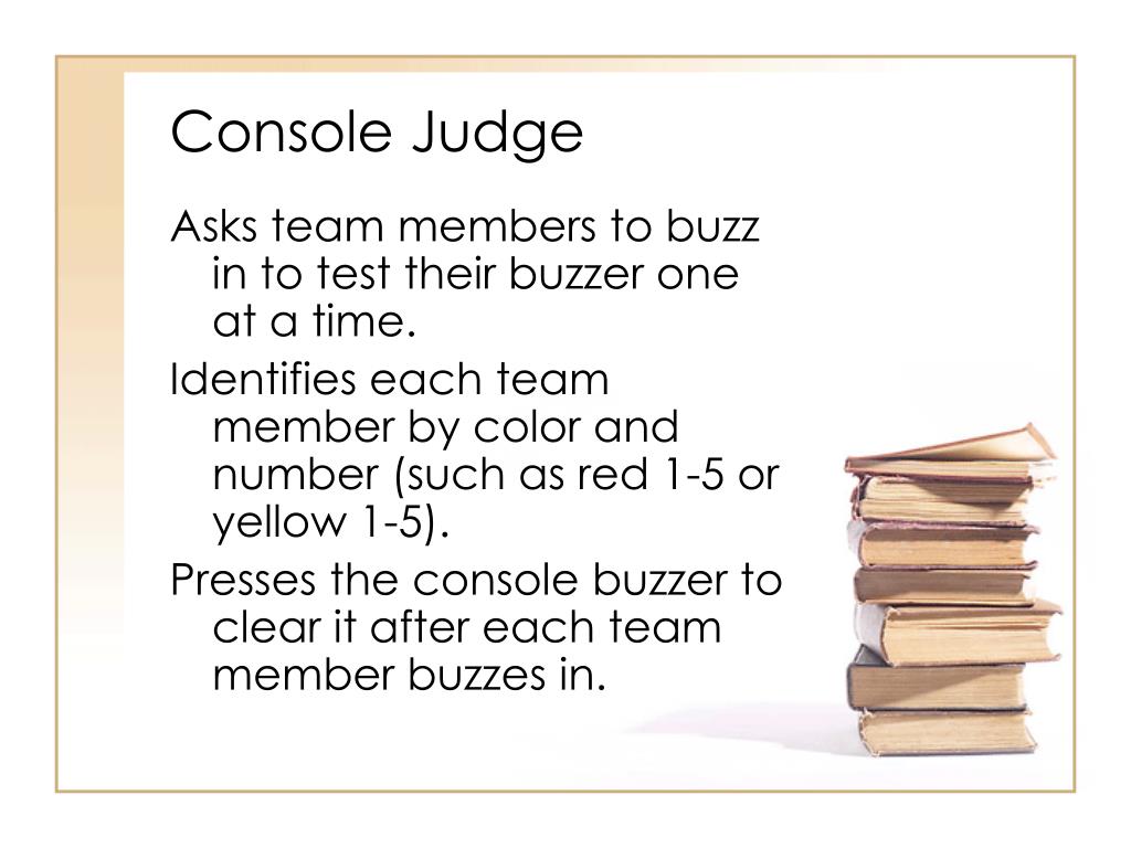 Console Judge Asks team members to buzz in to test their buzzer one at a time. Identifies each team member by color and number (such as red 1-5 or yellow 1-5). Presses the console buzzer to clear it after each team member buzzes in.
