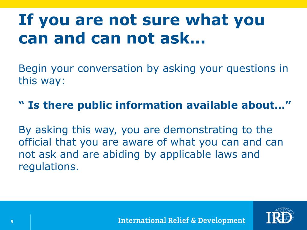 If you are not sure what you can and can not ask… Begin your conversation by asking your questions in this way: “ Is there public information available about…” By asking this way, you are demonstrating to the official that you are aware of what you can and can not ask and are abiding by applicable laws and regulations.