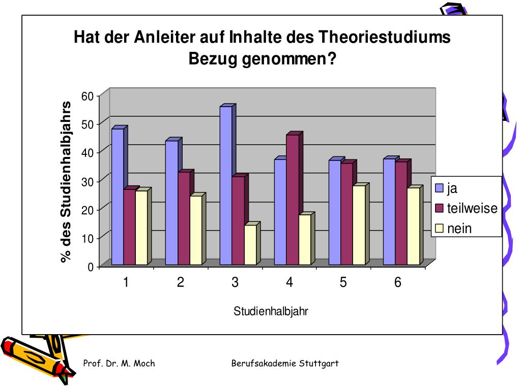 Auswertungsdimensionen • Zufriedenheit mit den Praxisphasen und Begründungen • Praxisanleitung: Fachlichkeit, Verläßlichkeit, Umfang • Wertschätzung der Arbeit des BA-Studierenden Berufsakademie Stuttgart