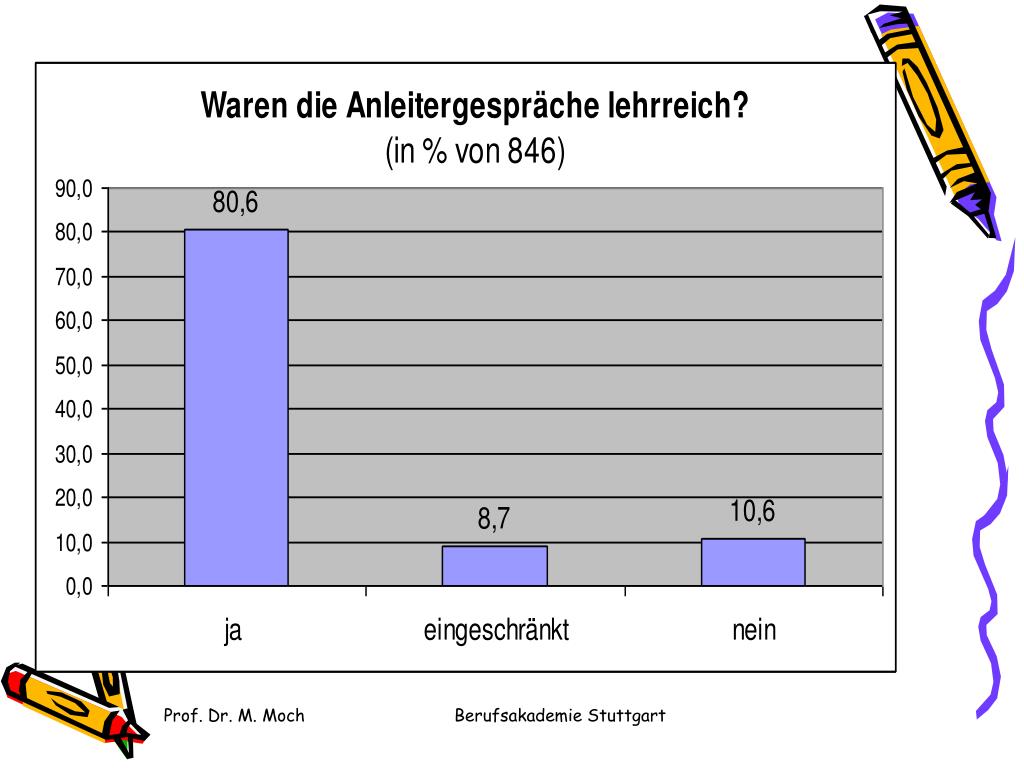 Beispiele für Unzufriedenheit „wenig Vermittlung theoretischer Hintergründe“ „ „..es gab keine Anleitergespräche…“ „Gespräche dienten (nur) Organisatorischem.“ „…durch Krankheit fielen Gespräche aus.“ „…Gespräche haben mir deutlich gemacht was ich falsch mache, aber nicht wie ich es ändern soll .“ Berufsakademie Stuttgart