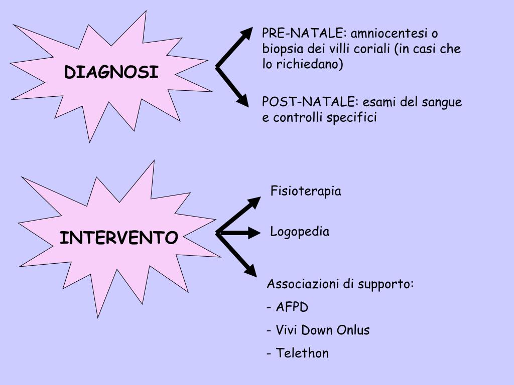 PRE-NATALE: amniocentesi o biopsia dei villi coriali (in casi che lo richiedano) DIAGNOSI POST-NATALE: esami del sangue e controlli specifici Fisioterapia Logopedia INTERVENTO • Associazioni di supporto: • AFPD • Vivi Down Onlus • Telethon