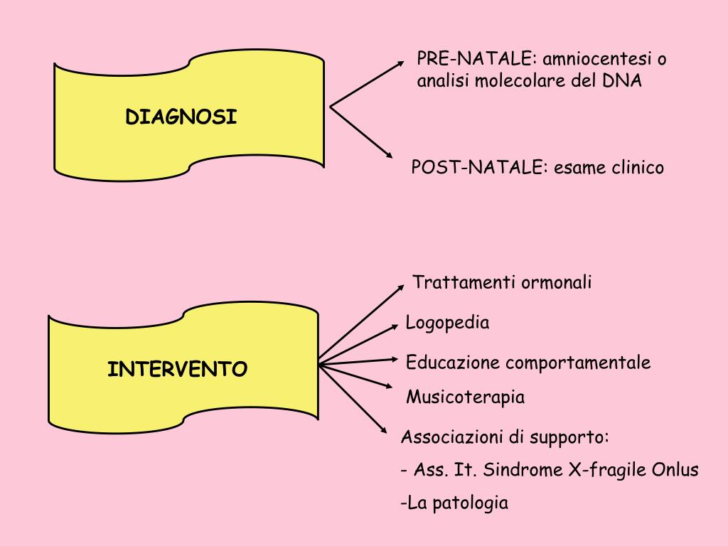 PRE-NATALE: amniocentesi o analisi molecolare del DNA DIAGNOSI POST-NATALE: esame clinico Trattamenti ormonali Logopedia Educazione comportamentale INTERVENTO Musicoterapia • Associazioni di supporto: • - Ass. It. Sindrome X-fragile Onlus • La patologia