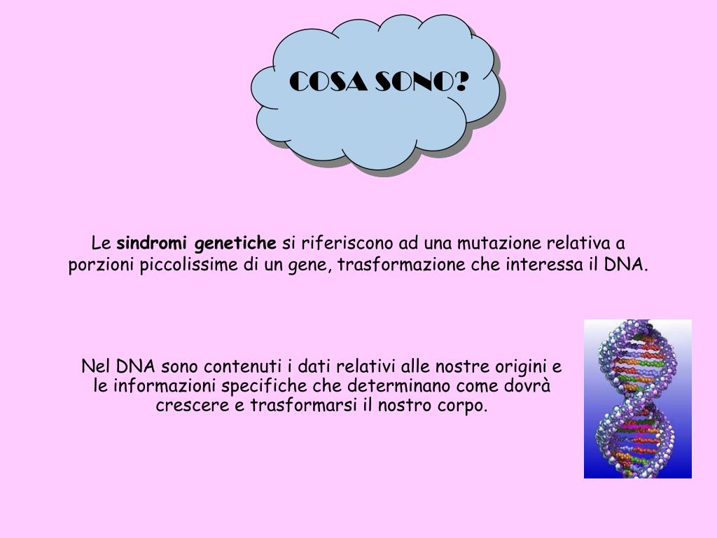 COSA SONO? Le sindromi genetiche si riferiscono ad una mutazione relativa a porzioni piccolissime di un gene, trasformazione che interessa il DNA. Nel DNA sono contenuti i dati relativi alle nostre origini e le informazioni specifiche che determinano come dovrà crescere e trasformarsi il nostro corpo.