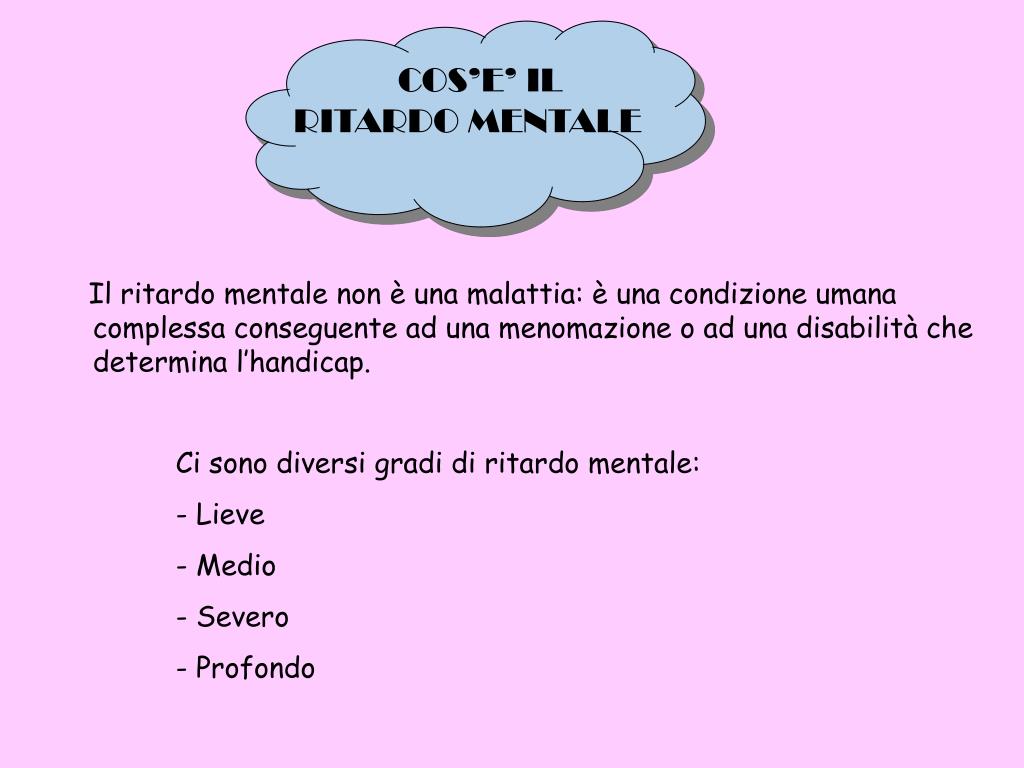 COS’E’ IL RITARDO MENTALE Il ritardo mentale non è una malattia: è una condizione umana complessa conseguente ad una menomazione o ad una disabilità che determina l’handicap. • Ci sono diversi gradi di ritardo mentale: • Lieve • Medio • Severo • Profondo