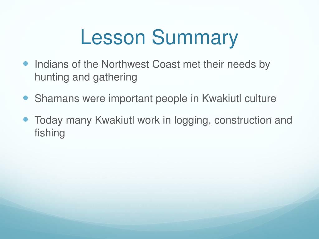 Lesson Summary • Indians of the Northwest Coast met their needs by hunting and gathering • Shamans were important people in Kwakiutl culture • Today many Kwakiutl work in logging, construction and fishing