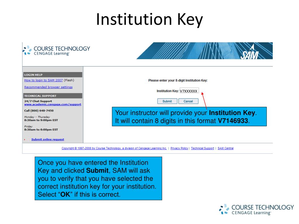 Institution Key V7XXXXXX Your instructor will provide your Institution Key. It will contain 8 digits in this format V7146933. Once you have entered the Institution Key and clicked Submit, SAM will ask you to verify that you have selected the correct institution key for your institution. Select “OK” if this is correct.