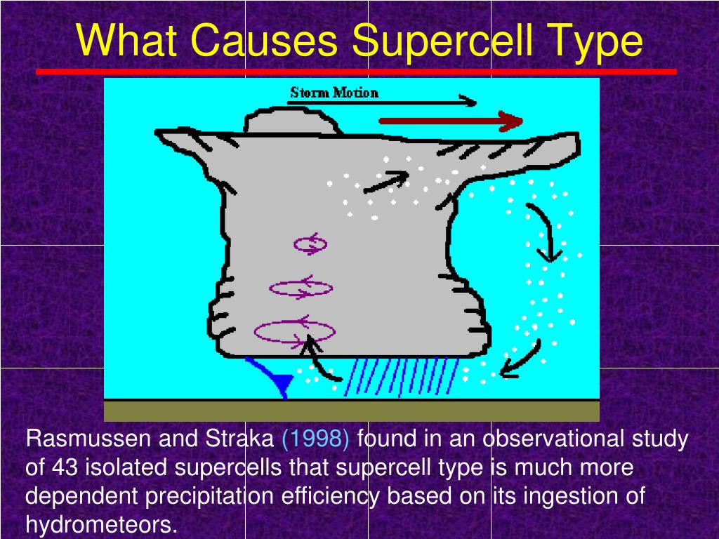 What Causes Supercell Type Rasmussen and Straka (1998) found in an observational study of 43 isolated supercells that supercell type is much more dependent precipitation efficiency based on its ingestion of hydrometeors.
