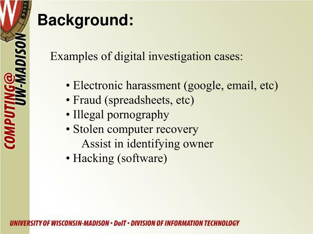 Background: • Examples of digital investigation cases: • Electronic harassment (google, email, etc) • Fraud (spreadsheets, etc) • Illegal pornography • Stolen computer recovery • Assist in identifying owner • Hacking (software)