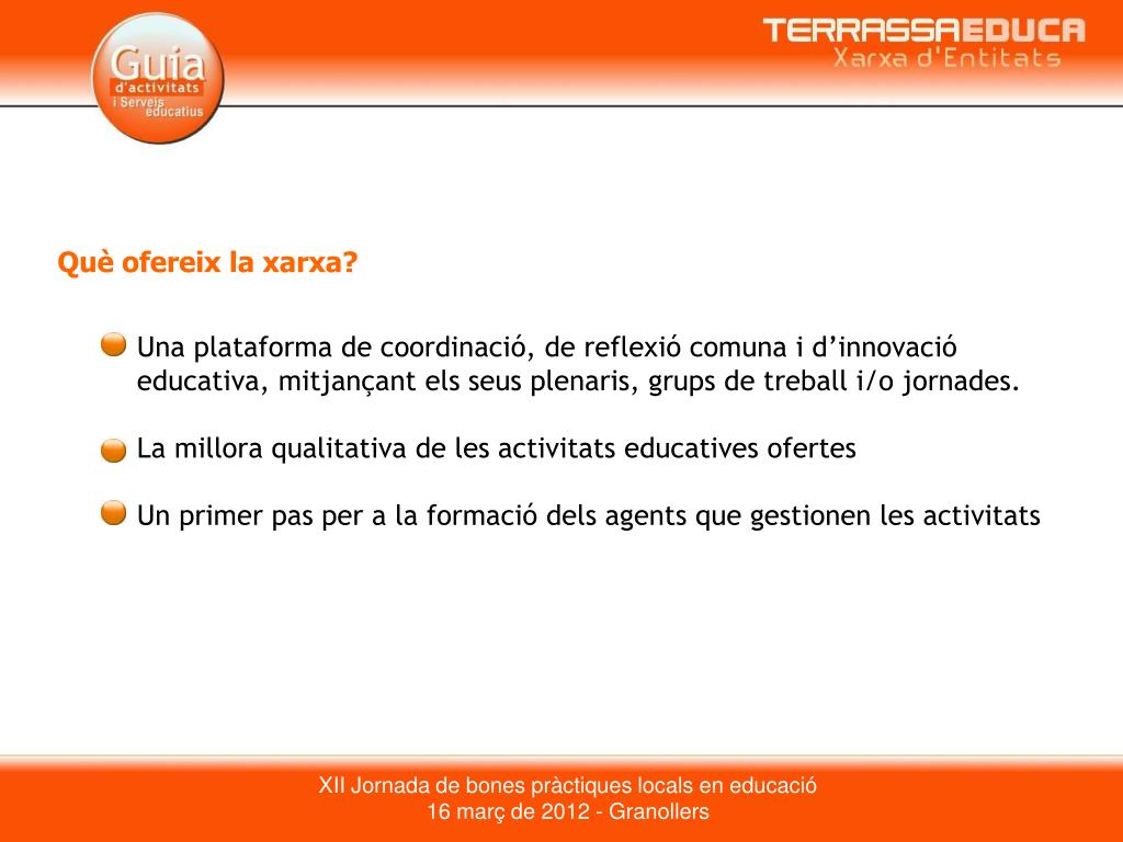 Què ofereix la xarxa? Una plataforma de coordinació, de reflexió comuna i d’innovació educativa, mitjançant els seus plenaris, grups de treball i/o jornades. La millora qualitativa de les activitats educatives ofertes Un primer pas per a la formació dels agents que gestionen les activitats XII Jornada de bones pràctiques locals en educació 16 març de 2012 - Granollers