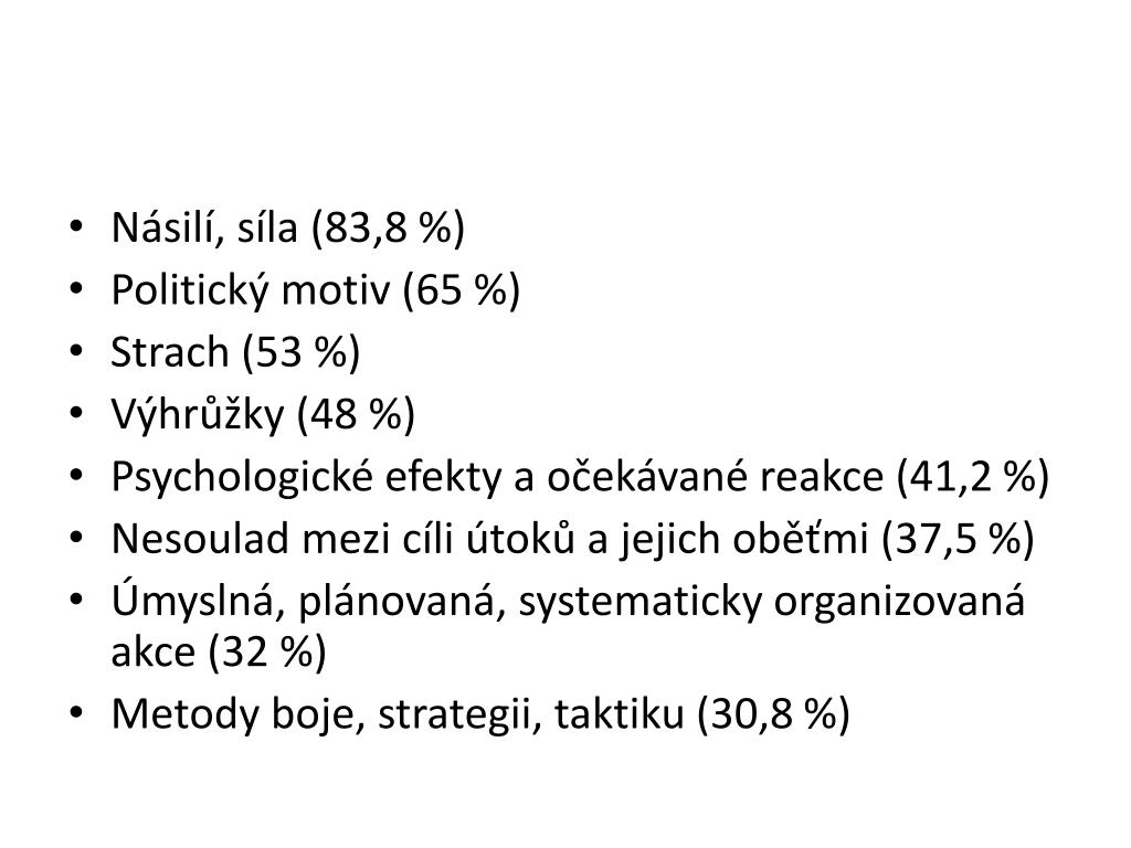 Násilí, síla (83,8 %) • Politický motiv (65 %) • Strach (53 %) • Výhrůžky (48 %) • Psychologické efekty a očekávané reakce (41,2 %) • Nesoulad mezi cíli útoků a jejich oběťmi (37,5 %) • Úmyslná, plánovaná, systematicky organizovaná akce (32 %) • Metody boje, strategii, taktiku (30,8 %)