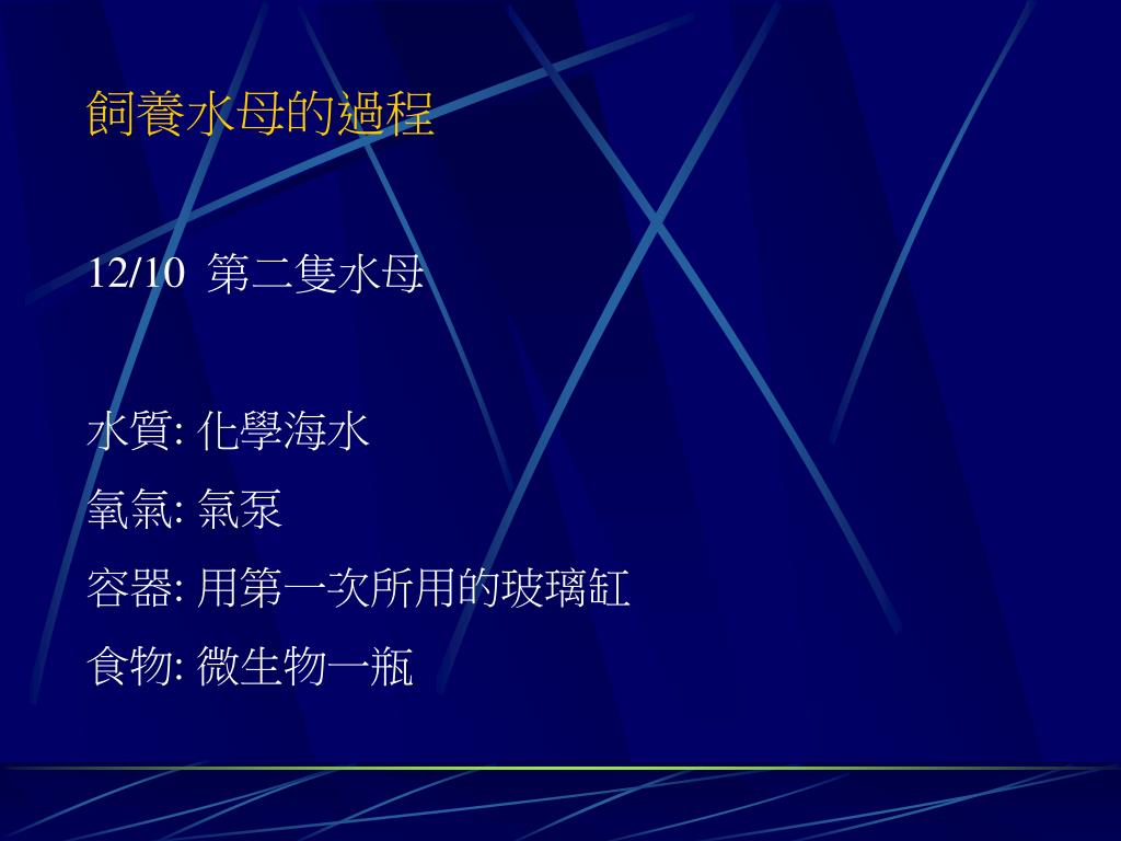 飼養水母的過程 12/10 第二隻水母 水質: 化學海水 氧氣: 氣泵 容器: 用第一次所用的玻璃缸 食物: 微生物一瓶