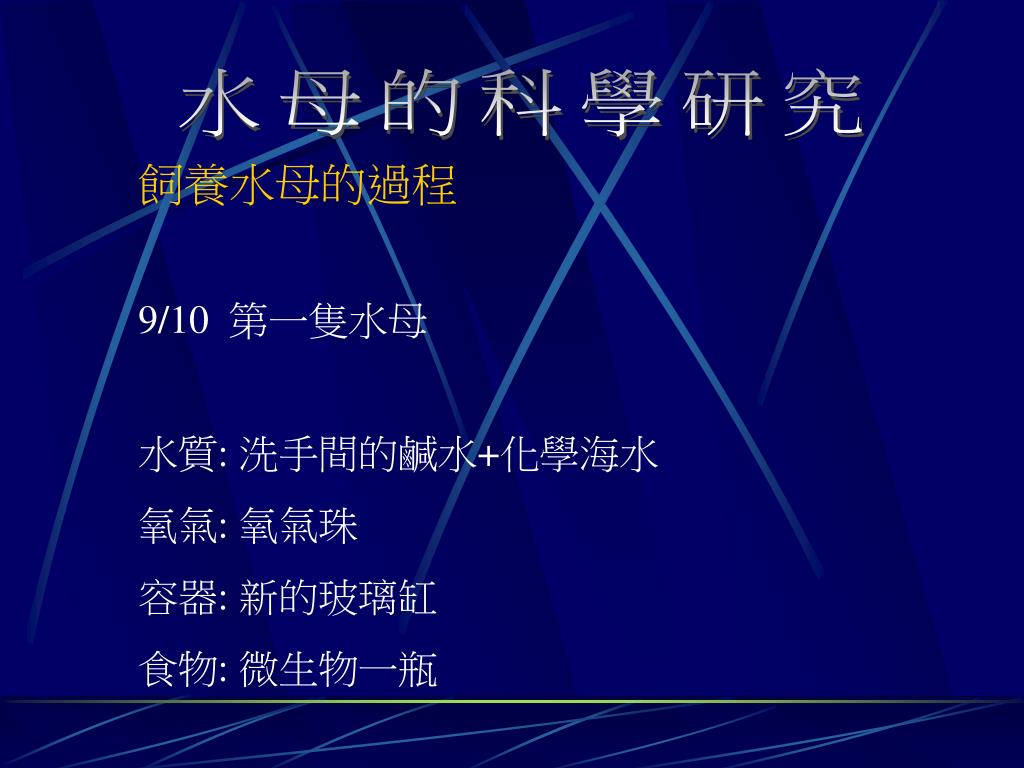 水母的科學研究 飼養水母的過程 9/10 第一隻水母 水質: 洗手間的鹹水+化學海水 氧氣: 氧氣珠 容器: 新的玻璃缸 食物: 微生物一瓶