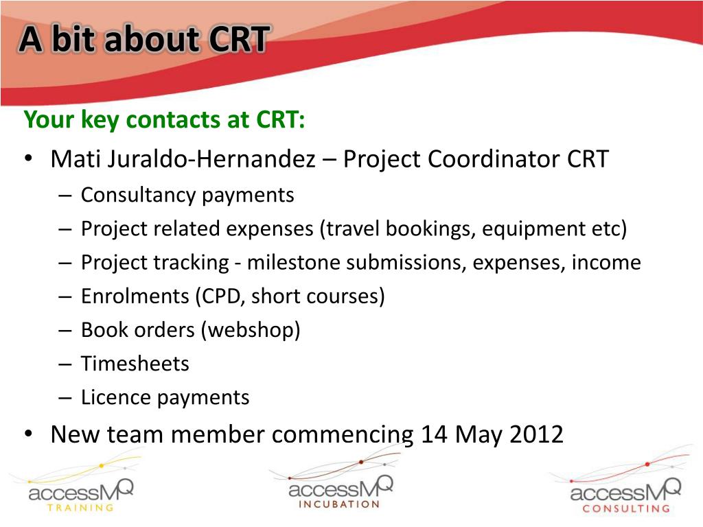 A bit about CRT Your key contacts at CRT: • Mati Juraldo-Hernandez – Project Coordinator CRT • Consultancy payments • Project related expenses (travel bookings, equipment etc) • Project tracking - milestone submissions, expenses, income • Enrolments (CPD, short courses) • Book orders (webshop) • Timesheets • Licence payments • New team member commencing 14 May 2012
