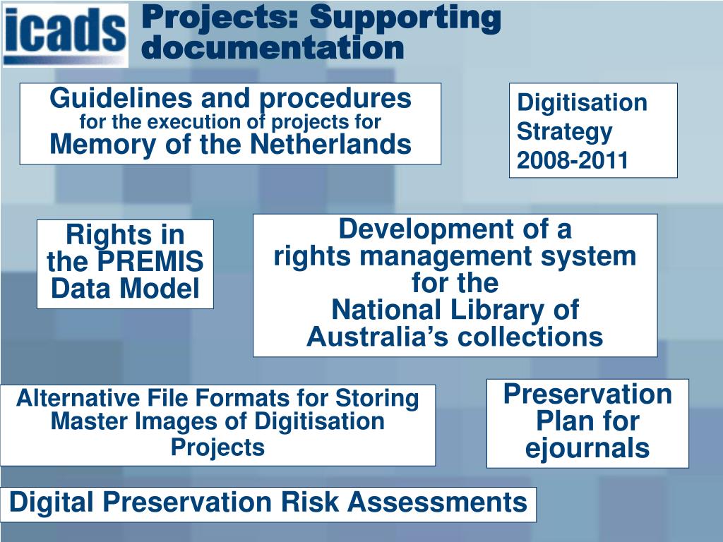 Guidelines and procedures for the execution of projects for Memory of the Netherlands Digitisation Strategy 2008-2011 Projects: Supporting documentation Development of a rights management system for the National Library of Australia’s collections Rights in the PREMIS Data Model Preservation Plan for ejournals Alternative File Formats for Storing Master Images of Digitisation Projects Digital Preservation Risk Assessments