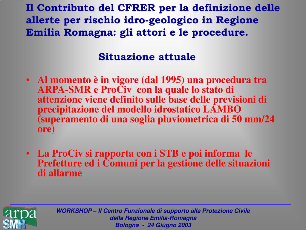 Il Contributo del CFRER per la definizione delle allerte per rischio idro-geologico in Regione Emilia Romagna: gli attori e le procedure. Situazione attuale • Al momento è in vigore (dal 1995) una procedura tra ARPA-SMR e ProCiv con la quale lo stato di attenzione viene definito sulle base delle previsioni di precipitazione del modello idrostatico LAMBO (superamento di una soglia pluviometrica di 50 mm/24 ore) • La ProCiv si rapporta con i STB e poi informa le Prefetture ed i Comuni per la gestione delle situazioni di allarme