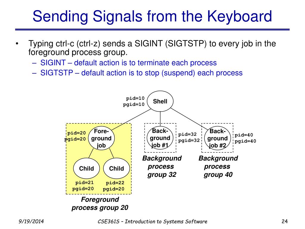 Sending Signals from the Keyboard • Typing ctrl-c (ctrl-z) sends a SIGINT (SIGTSTP) to every job in the foreground process group. • SIGINT – default action is to terminate each process • SIGTSTP – default action is to stop (suspend) each process Shell pid=10 pgid=10 Fore- ground job Back- ground job #1 Back- ground job #2 pid=20 pgid=20 pid=32 pgid=32 pid=40 pgid=40 Background process group 32 Background process group 40 Child Child pid=21 pgid=20 pid=22 pgid=20 Foreground process group 20 CSE361S – Introduction to Systems Software