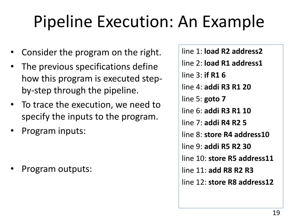 Pipeline Execution: An Example • Consider the program on the right. • The previous specifications define how this program is executed step-by-step through the pipeline. • To trace the execution, we need to specify the inputs to the program. • Program inputs: • address1, let's assume it contains 0. • address2, let's assume it contains 10. • Program outputs: • address10 • address11 • address12 line 1: load R2 address2 line 2: load R1 address1 line 3: if R1 6 line 4: addi R3 R1 20 line 5: goto 7 line 6: addi R3 R1 10 line 7:addi R4 R2 5 line 8: store R4 address10 line 9: addi R5 R2 30 line 10: store R5 address11 line 11: add R8 R2 R3 line 12: store R8 address12