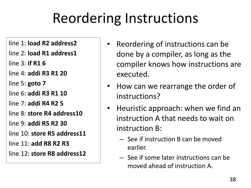 Reordering Instructions • Reordering of instructions can be done by a compiler, as long as the compiler knows how instructions are executed. • How can we rearrange the order of instructions? • Heuristic approach: when we find an instruction A that needs to wait on instruction B: • See if instruction B can be moved earlier. • See if some later instructions can be moved ahead of instruction A. line 1: load R2 address2 line 2: load R1 address1 line 3: if R1 6 line 4: addi R3 R1 20 line 5: goto 7 line 6: addi R3 R1 10 line 7:addi R4 R2 5 line 8: store R4 address10 line 9: addi R5 R2 30 line 10: store R5 address11 line 11: add R8 R2 R3 line 12: store R8 address12