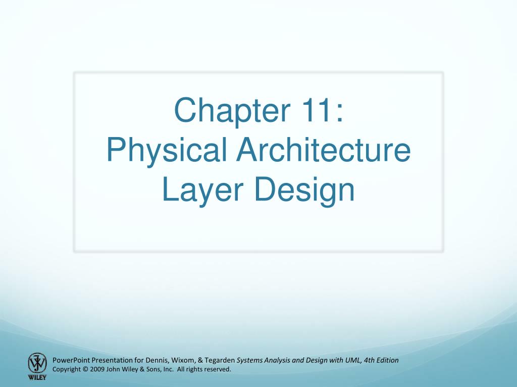 Objectives Understand the different physical architecture components. Understand server-based, client-based, and client–server physical architectures. Be familiar with cloud computing and Green IT. Be able to create a network model using a deployment diagram. Be familiar with how to create a hardware and software specification. Understand how operational, performance, security, cultural, and political requirements affect the design of the physical architecture layer.