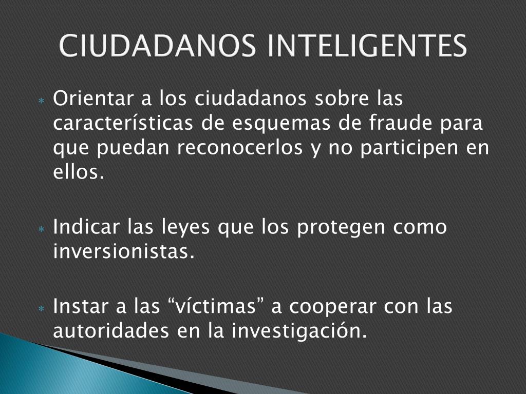 CIUDADANOS INTELIGENTES • Orientar a los ciudadanos sobre las características de esquemas de fraude para que puedan reconocerlos y no participen en ellos. • Indicar las leyes que los protegen como inversionistas. • Instar a las “víctimas” a cooperar con las autoridades en la investigación.