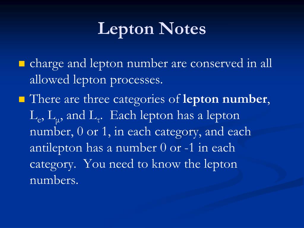 Lepton Notes • charge and lepton number are conserved in all allowed lepton processes. • There are three categories of lepton number, Le, Lμ, and Lτ. Each lepton has a lepton number, 0 or 1, in each category, and each antilepton has a number 0 or -1 in each category. You need to know the lepton numbers.
