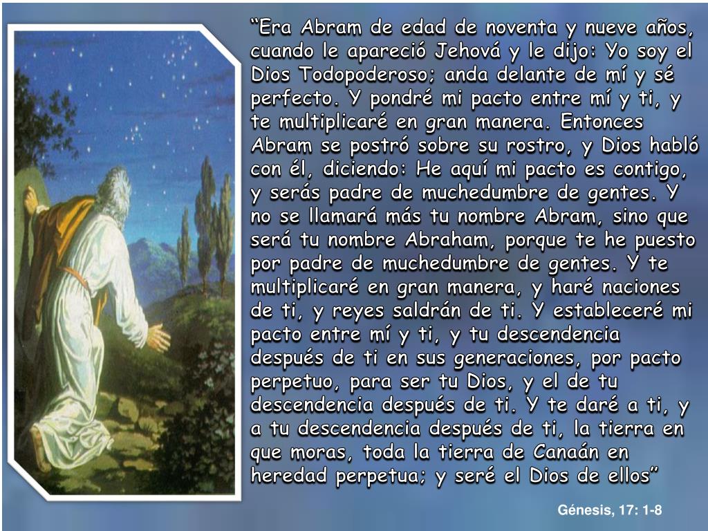 “Era Abram de edad de noventa y nueve años, cuando le apareció Jehová y le dijo: Yo soy el Dios Todopoderoso; anda delante de mí y sé perfecto. Y pondré mi pacto entre mí y ti, y te multiplicaré en gran manera. Entonces Abram se postró sobre su rostro, y Dios habló con él, diciendo: He aquí mi pacto es contigo, y serás padre de muchedumbre de gentes. Y no se llamará más tu nombre Abram, sino que será tu nombre Abraham, porque te he puesto por padre de muchedumbre de gentes. Y te multiplicaré en gran manera, y haré naciones de ti, y reyes saldrán de ti. Y estableceré mi pacto entre mí y ti, y tu descendencia después de ti en sus generaciones, por pacto perpetuo, para ser tu Dios, y el de tu descendencia después de ti. Y te daré a ti, y a tu descendencia después de ti, la tierra en que moras, toda la tierra de Canaán en heredad perpetua; y seré el Dios de ellos” Génesis, 17: 1-8