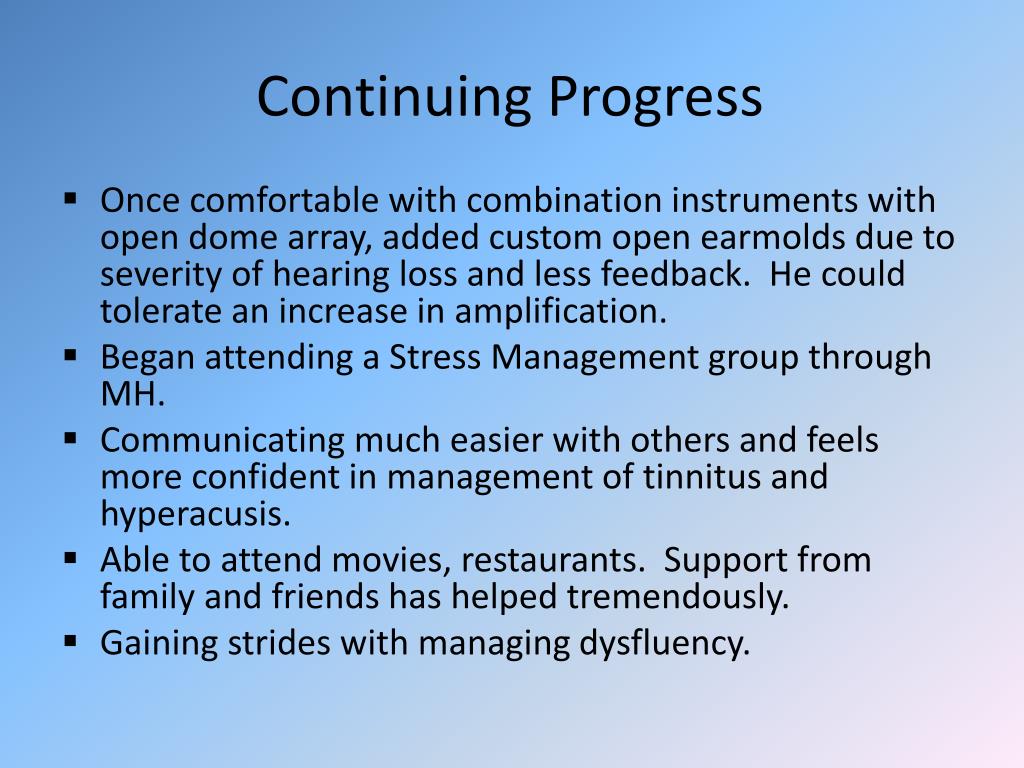 Continuing Progress • Once comfortable with combination instruments with open dome array, added custom open earmolds due to severity of hearing loss and less feedback. He could tolerate an increase in amplification. • Began attending a Stress Management group through MH. • Communicating much easier with others and feels more confident in management of tinnitus and hyperacusis. • Able to attend movies, restaurants. Support from family and friends has helped tremendously. • Gaining strides with managing dysfluency.