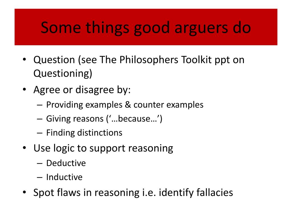Some things good arguers do • Question (see The Philosophers Toolkit ppt on Questioning) • Agree or disagree by: • Providing examples & counter examples • Giving reasons (‘…because…’) • Finding distinctions • Use logic to support reasoning • Deductive • Inductive • Spot flaws in reasoning i.e. identify fallacies