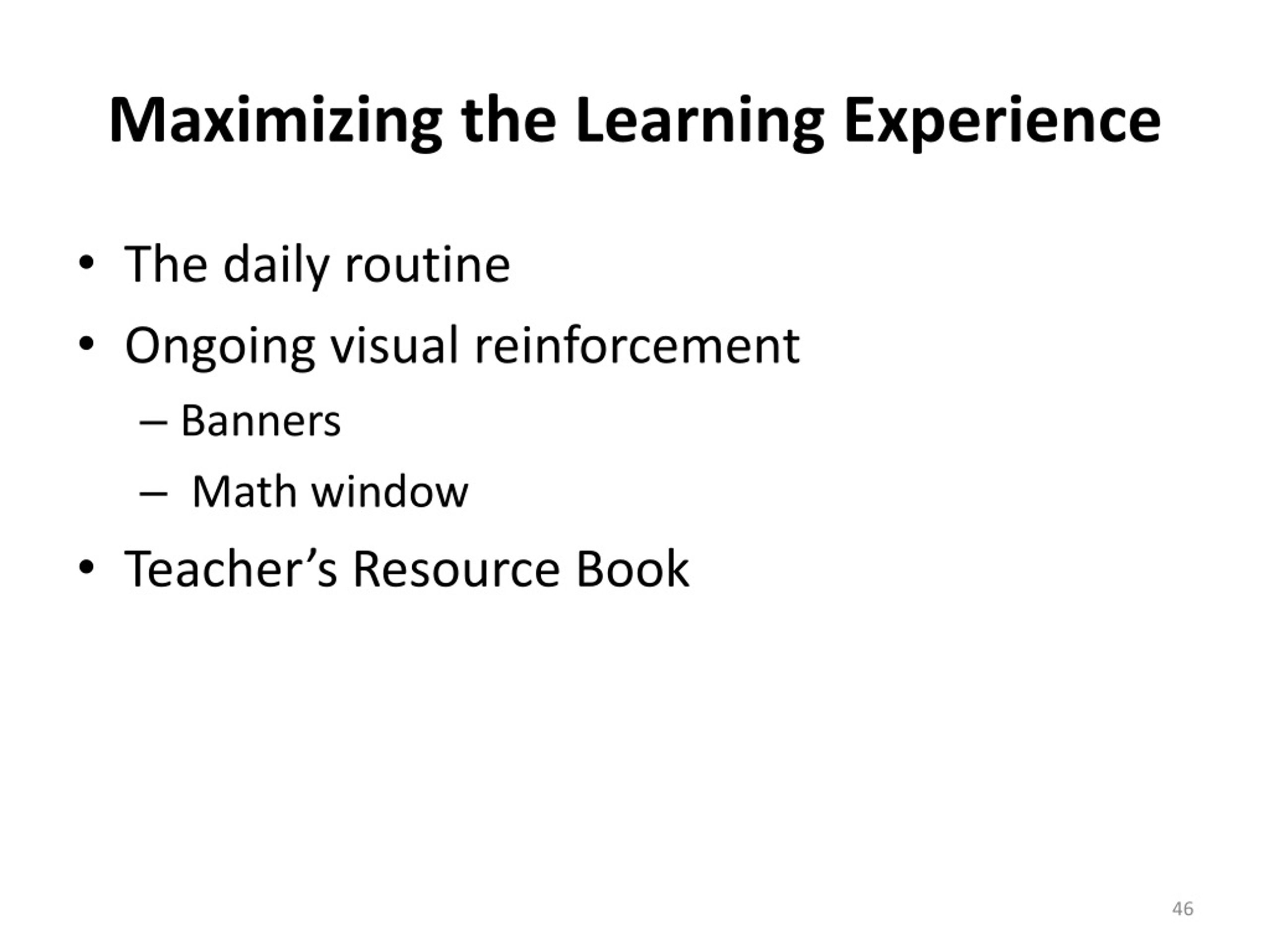 Maximizing the Learning Experience • The daily routine • Ongoing visual reinforcement • Banners • Math window • Teacher’s Resource Book