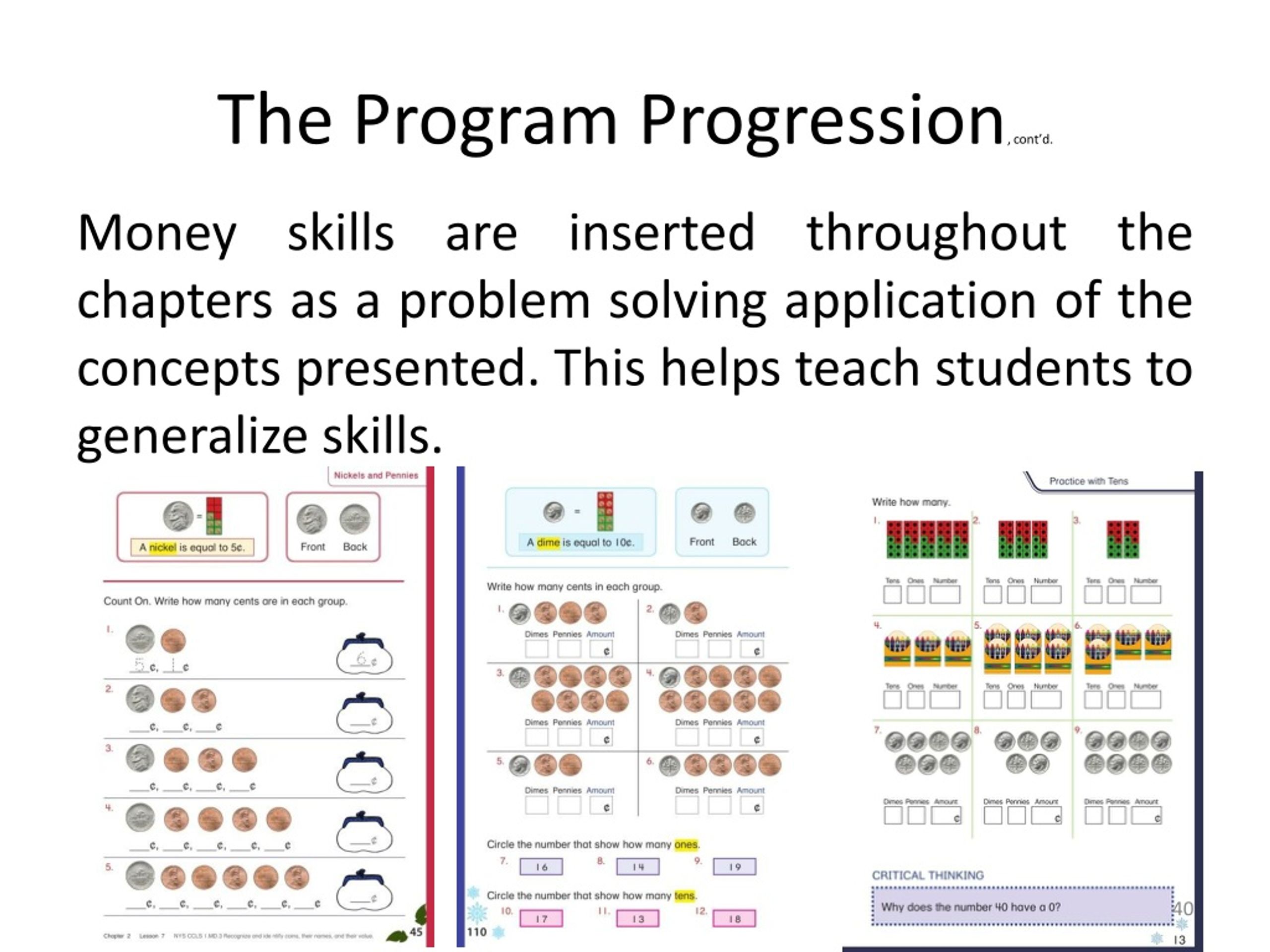 The Program Progression, cont’d. Money skills are inserted throughout the chapters as a problem solving application of the concepts presented. This helps teach students to generalize skills.