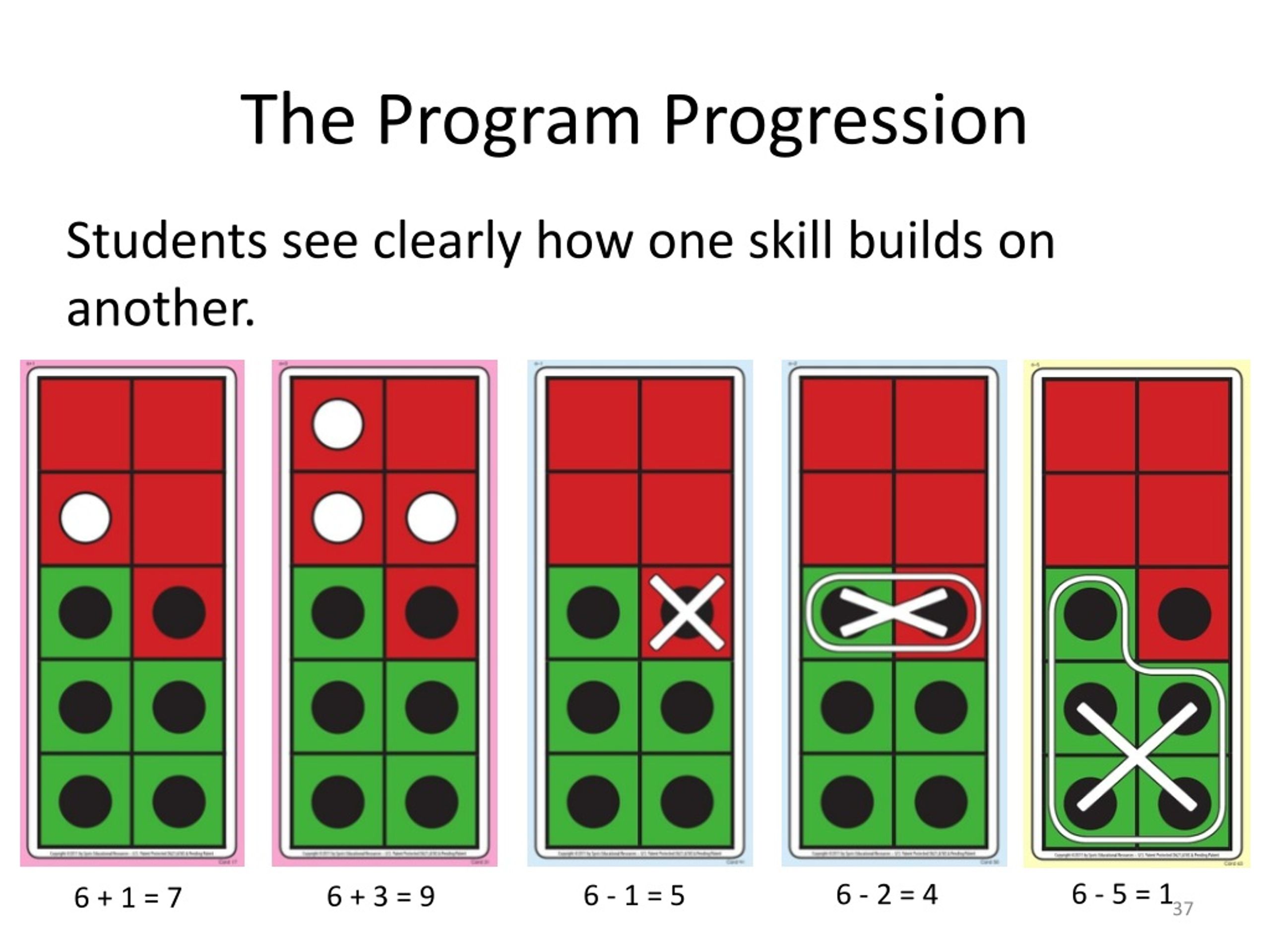 The Program Progression Students see clearly how one skill builds on another. • 6 - 5 = 1 • 6 - 2 = 4 • 6 - 1 = 5 • 6 + 3 = 9 • 6 + 1 = 7