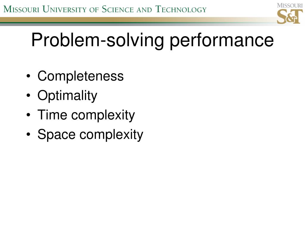 Problem-solving performance • Completeness • Optimality • Time complexity • Space complexity