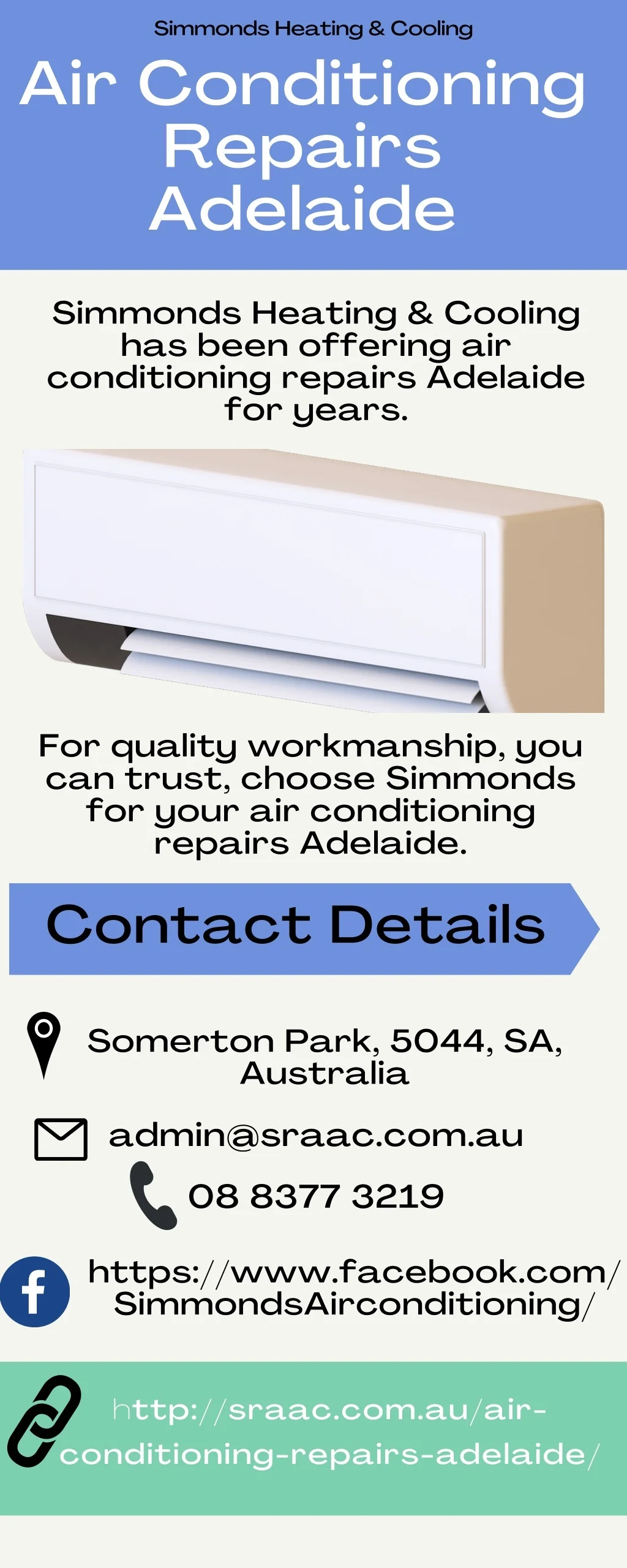 Simmonds Heating & Cooling Air Conditioning Repairs Adelaide Simmonds Heating & Cooling has been offering air conditioning repairs Adelaide for years. For quality workmanship, you can trust, choose Simmonds for your air conditioning repairs Adelaide. Contact Details Somerton Park,5044, SA, Australia admin@sraac.com.au 0883773219 https://www.facebook.com/ SimmondsAirconditioning/ http://sraac.com.au/air- conditioning-repairs-adelaide/