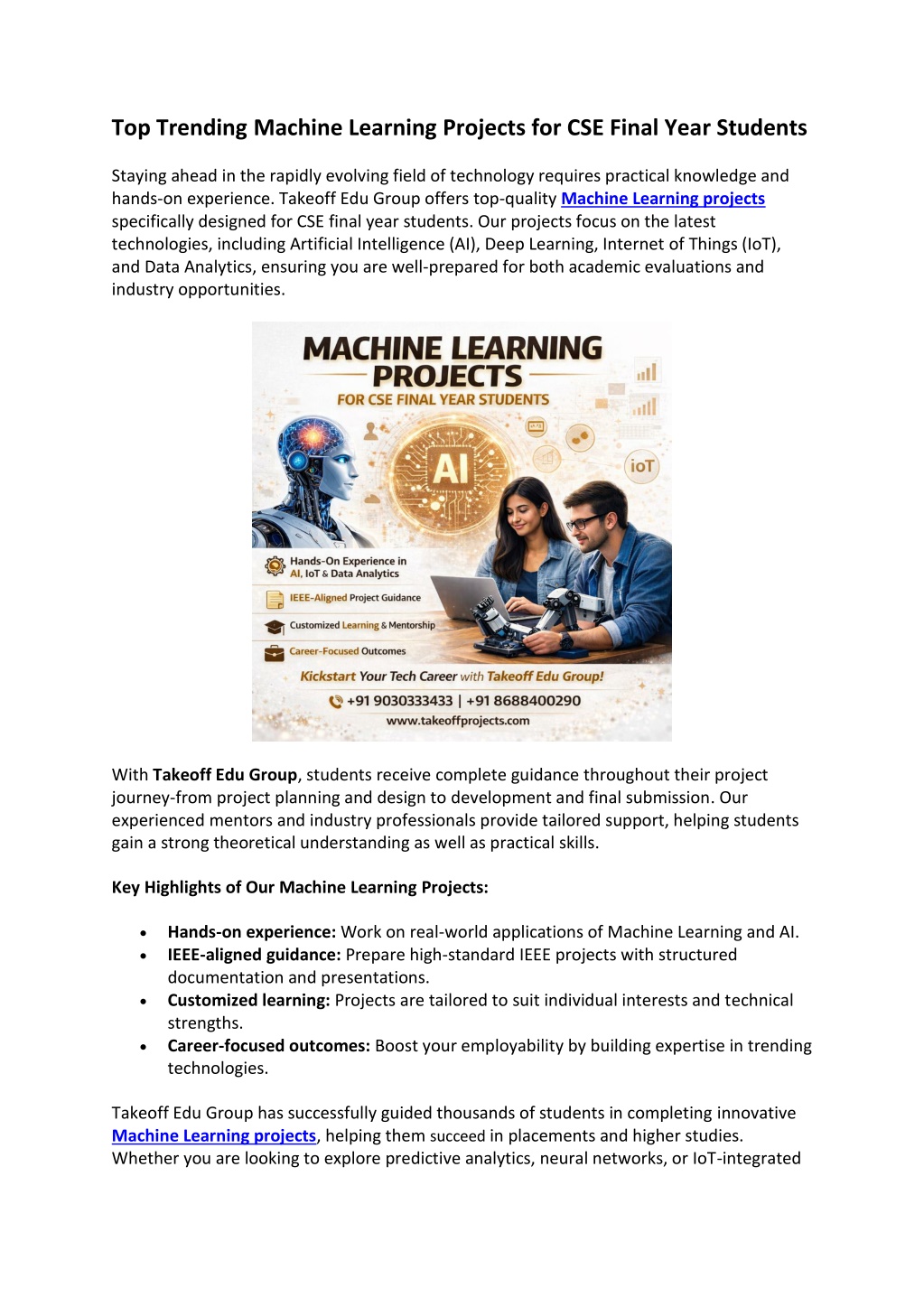 1. Top Trending Machine Learning Projects for CSE Final Year Students Staying ahead in the rapidly evolving field of technology requires practical knowledge and hands-on experience. Takeoff Edu Group offers top-quality Machine Learning projects specifically designed for CSE final year students. Our projects focus on the latest technologies, including Artificial Intelligence (AI), Deep Learning, Internet of Things (IoT), and Data Analytics, ensuring you are well-prepared for both academic evaluations and industry opportunities. With Takeoff Edu Group, students receive complete guidance throughout their project journey-from project planning and design to development and final submission. Our experienced mentors and industry professionals provide tailored support, helping students gain a strong theoretical understanding as well as practical skills. Key Highlights of Our Machine Learning Projects: Hands-on experience: Work on real-world applications of Machine Learning and AI. IEEE-aligned guidance: Prepare high-standard IEEE projects with structured documentation and presentations. Customized learning: Projects are tailored to suit individual interests and technical strengths. Career-focused outcomes: Boost your employability by building expertise in trending technologies. Takeoff Edu Group has successfully guided thousands of students in completing innovative Machine Learning projects, helping them succeed in placements and higher studies. Whether you are looking to explore predictive analytics, neural networks, or IoT-integrated