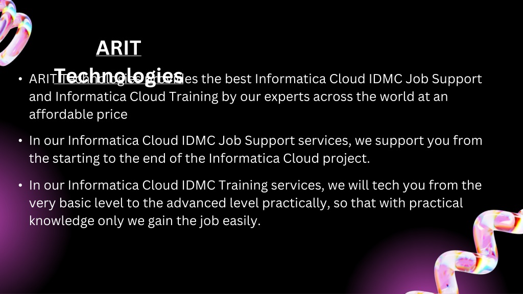 4. ARIT Technologies • ARIT Technologies provides the best Informatica Cloud IDMC Job Support and Informatica Cloud Training by our experts across the world at an affordable price • In our Informatica Cloud IDMC Job Support services, we support you from the starting to the end of the Informatica Cloud project. • In our Informatica Cloud IDMC Training services, we will tech you from the very basic level to the advanced level practically, so that with practical knowledge only we gain the job easily.