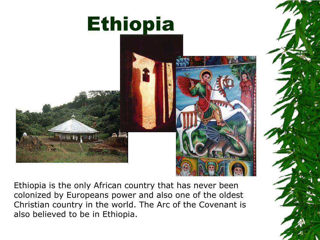 Ethiopia Ethiopia is the only African country that has never been colonized by Europeans power and also one of the oldest Christian country in the world. The Arc of the Covenant is also believed to be in Ethiopia.