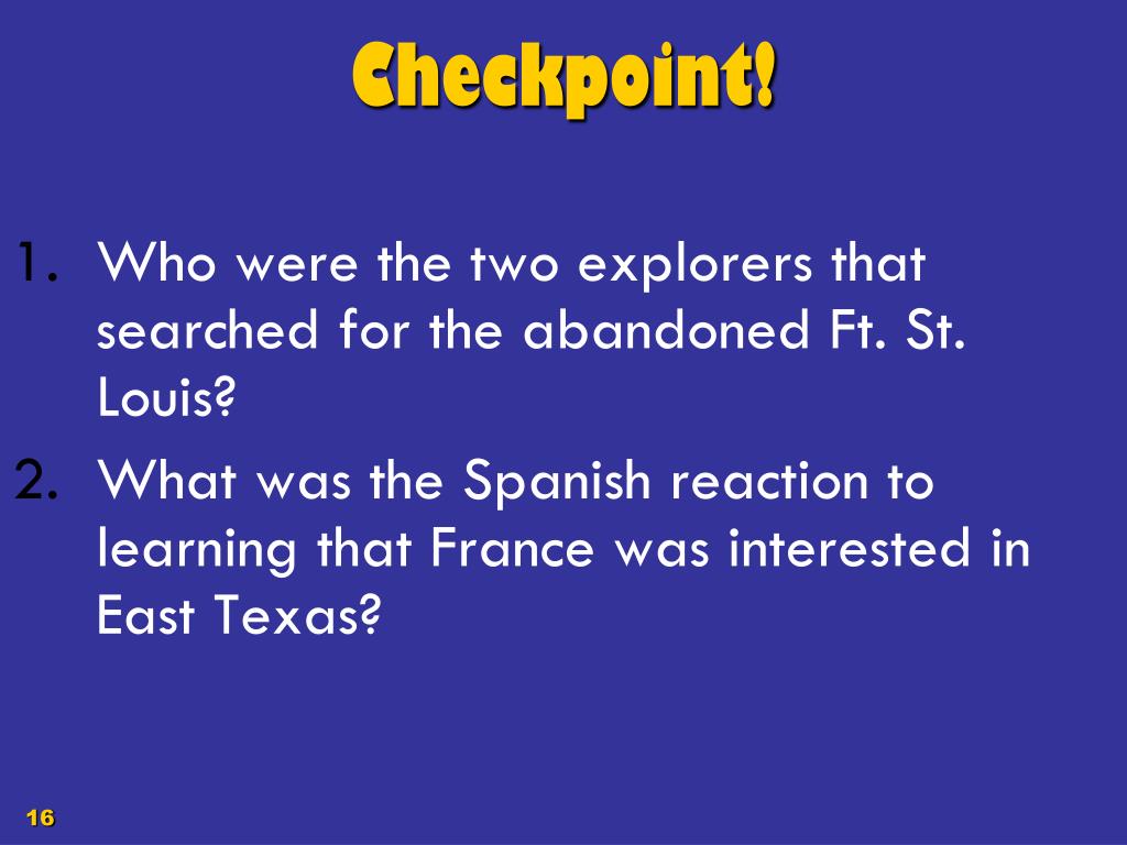 Checkpoint! • Who were the two explorers that searched for the abandoned Ft. St. Louis? • What was the Spanish reaction to learning that France was interested in East Texas?