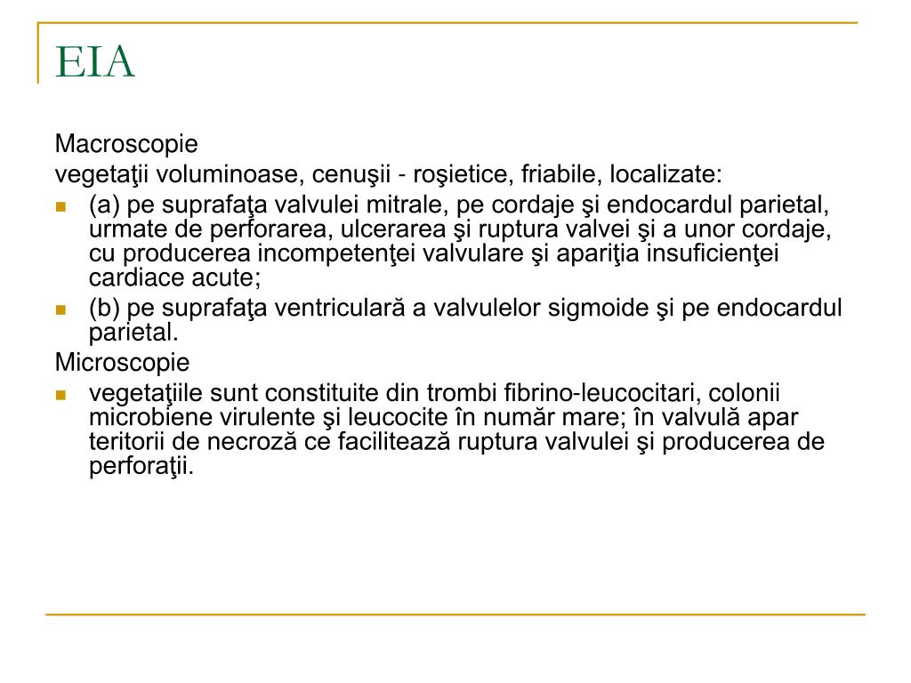 EIA Macroscopie vegetaţii voluminoase, cenuşii - roşietice, friabile, localizate: • (a) pe suprafaţa valvulei mitrale, pe cordaje şi endocardul parietal, urmate de perforarea, ulcerarea şi ruptura valvei şi a unor cordaje, cu producerea incompetenţei valvulare şi apariţia insuficienţei cardiace acute; • (b) pe suprafaţa ventriculară a valvulelor sigmoide şi pe endocardul parietal. Microscopie • vegetaţiile sunt constituite din trombi fibrino-leucocitari, colonii microbiene virulente şi leucocite în număr mare; în valvulă apar teritorii de necroză ce facilitează ruptura valvulei şi producerea de perforaţii.
