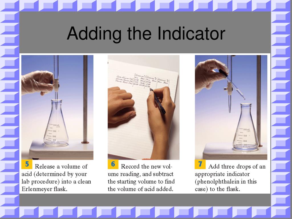 Let’s Work Another Sample Problem on the Board! A 15.5 mL sample of 0.215 M KOH solution required21.2 mL of aqueous acetic acid solution in a titration experiment. Calculate the molarity of the acetic acid solution. Answer: 0.157 M HC2H3O2