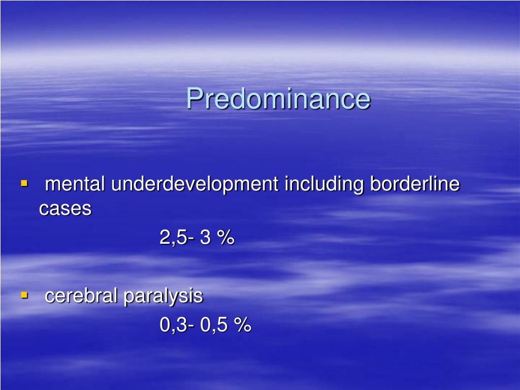 Predominance • mental underdevelopment including borderline cases 2,5- 3 % • cerebral paralysis 0,3- 0,5 %