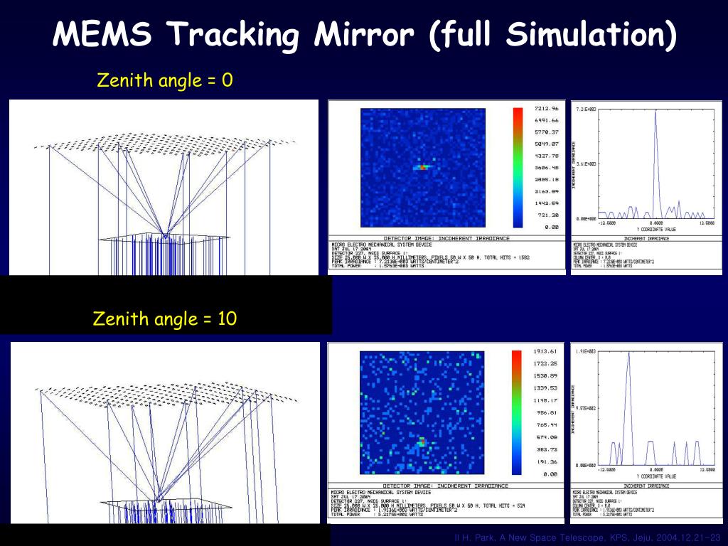 Zenith angle = 10 MEMS Tracking Mirror (full Simulation) Zenith angle = 0 Il H. Park, A New Space Telescope, KPS, Jeju, 2004.12.21-23